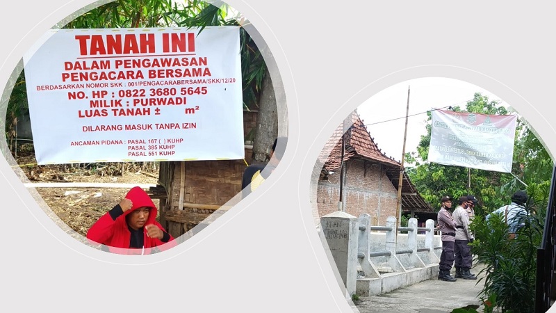Sejumlah warga sedang memasang banner larangan memasuki pekarangan tanpa ijin untuk menghalau pekerja Sutet, Selasa (8/12/2020) / Istimewa