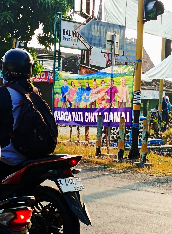 Spanduk Warga Pati Cinta Damai terlihat di perempatan Jakenan, Minggu (24/08/2025). Spanduk dengan desain dan gambar yang sama terpasang di banyak tempat strategis dan lokasi kerumunan warga di wilayah Kabupaten Pati. Tidak diketahui siapa pihak pemasangnya. / Dok. Clakclik.com