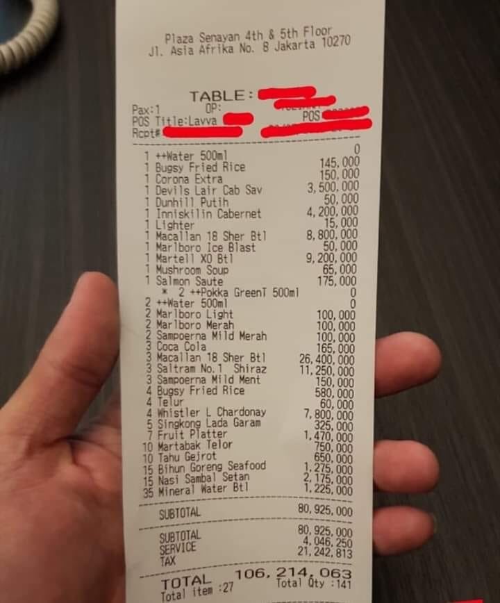 Clakclik.com, 30 Januari 2020—Menemukan sturk pembayaran tercecer barangkali sudah hal biasa. Namun menjadi hal yang tidak lazim jika saat kita baca isinya ternyata sebuah rincian pembelian makanan dan minuman yang total akhirnya sejumlah Rp. 100 juta lebih.