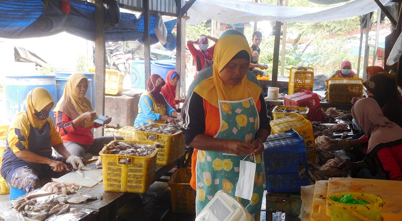Sejumlah pekerja perempuan sedang milet ikan di tempat usaha pilet ikan milik Munandirin di Desa Bumirejo, Juwana, Pati, Jateng, Sabtu (25/9/2021) / Clakclik.com